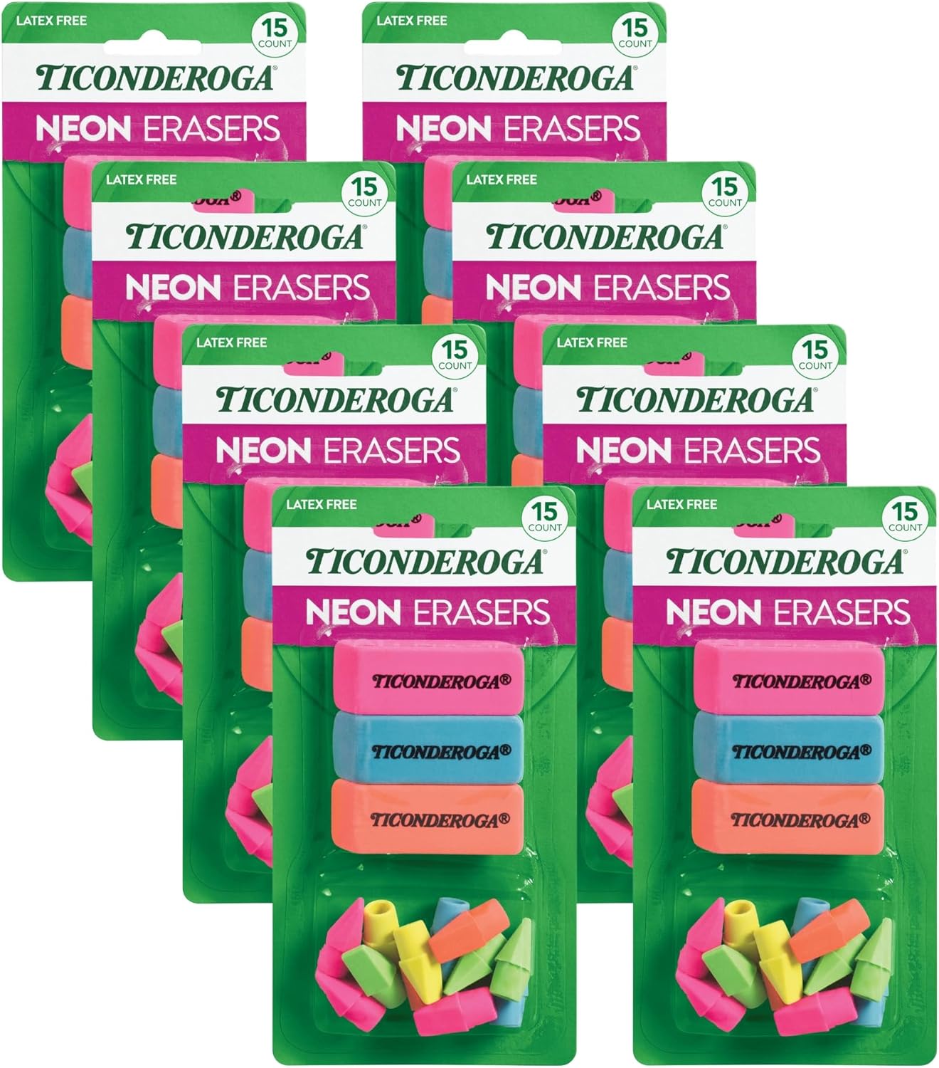 Ticonderoga Neon Erasers bring a little fun to your home. school or office. while still delivering the same great Ticonderoga performance you expect. Beveled edges give you ultimate control over what you remove from the surface. These soft. latex-free neon erasers cleanly remove black pencil marks. leaving you with a clear. smudge-free surface and minimal residue. Package contains 12 pencil top and 3 medium size. hand-held erasers in assorted neon colors.
